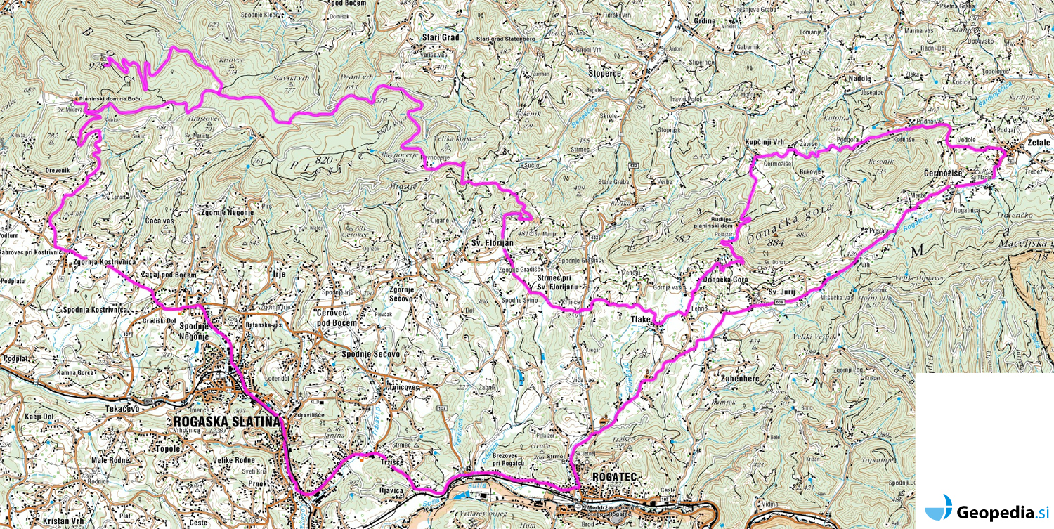 Rogaška Slatina, Rogatec, Sv. Jurij, Žetale, Kupčinji Vrh, Rudijev dom, Tlake, Ravnocerje, Boč, Planinski dom na Boču, Zgornja Kostrivnica, Spodnje Negonje, Rogaška Slatina |