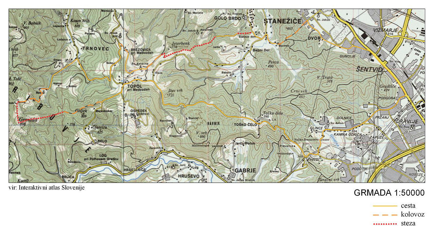 S turo začnemo v Šentvidu, od koder se po mestnih ulicah odpeljemo proti Podutiku, kjer se cesta proti Toškem čelu odcepi desno. Strma cesta nas pripelje do kmečkega turizma Bitenc. Makadamska cesta nas v krajših vzponih in spustih pripelje do Topola, od koder nadaljujemo v smeri naselja Belo. Po slabem kilometru se v desno odcepi markirana pot proti Grmadi. Sprva po vlaki, nato po stezi, se v položnem vzponu čez poraščeno sleme pripeljemo do njenega vznožja. V dobrih desetih minutah se s kolesom na ramah povzpnemo na razgleden vrh. Z vrha se spustimo na severno stran. Smer Gonte. V zgornje delu priporočam sestop, nato pa se pot položi in omogoča lep spust do turistične kmetije, mimo katere se po makadamski cesti spustimo v dolino. Glavni cesti se priključimo še pred naseljem Trnovec, od koder nadaljujemo desno proti Topolu. V križišču se usmerimo levo proti Sv. Jakobu. Še pred cerkvijo nadaljujemo po desnem kolovozu, ki nas pripelje v Brezovico. Mimo Sv. Katarine nadaljujemo do markirane poti. Sledi spust po vlaki, ki se kmalu zoži v prijetno vozno stezo. Pripelje nas k Slavkovemu domu. V križišču z glavno cesto zavijemo levo, že v naslednjem se v desno umaknemo nazaj na vlako. Po krajšem vzponu se spustimo v Stanežiče, od koder skozi ulice nadaljujemo do Celovške ceste ter naprej po kolesarski stezi do izhodišča. |