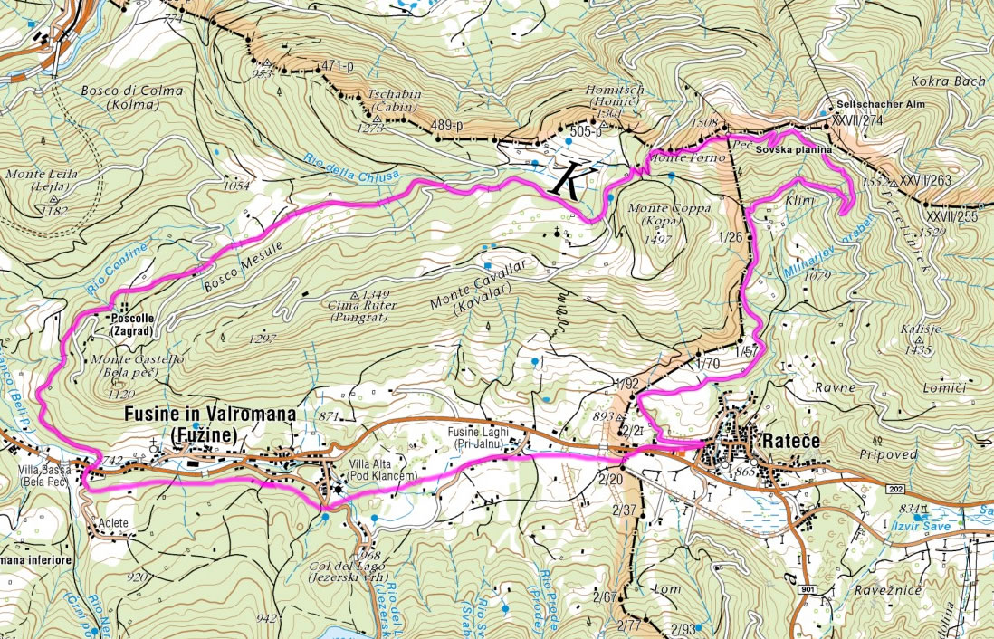 Rateče, Tromeja, Zagrad (Poscolle), Fužine (Fusine in Valromana), Rateče |