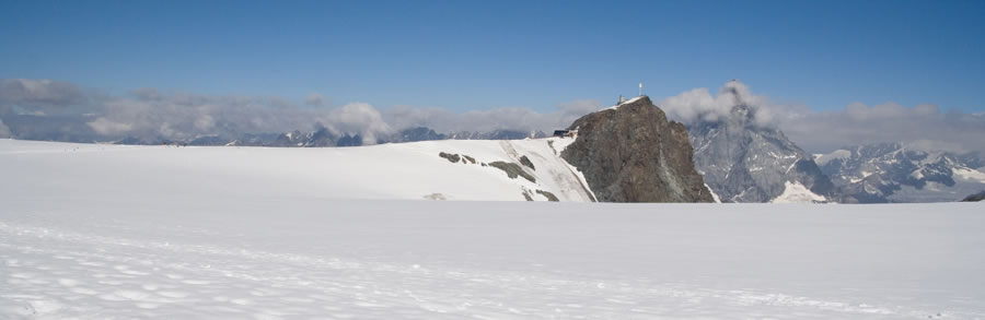 Zgornja postaja Klein Matterhorn, desno je Matterhorn, ki si s te strani komaj še zasluži ime